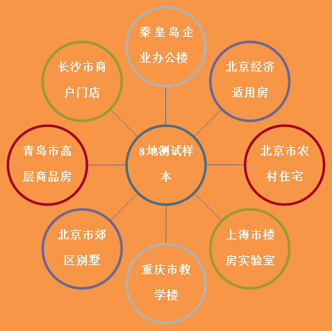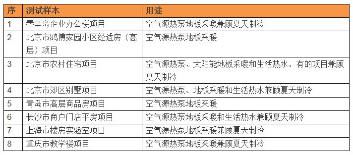 2011 年~2012年采暖季,課題組針對不同建筑類型、不同經濟水平、不同氣候區,其中居住建筑既有經濟適用房,城鎮別墅還有農村住宅,以及小型公建等有代表性 的項目,進行了相關測試。提取了近萬個低溫空氣源熱泵(太陽能)與地暖的組合系統建筑采暖能效數據。測試項目分類如下: